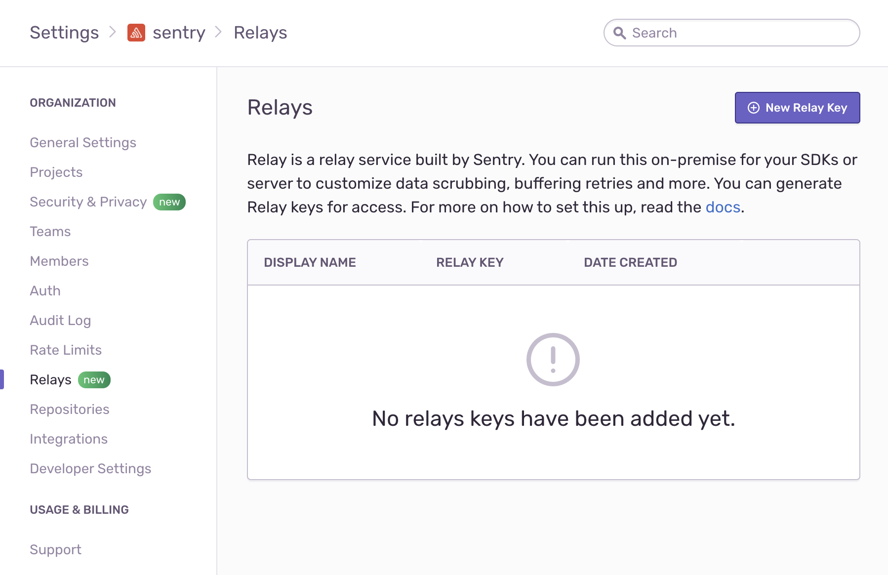 credentials.jsonfile or by running:Copieddocker run --rm -it \ -v "$(pwd)"/config/:/work/.relay/ \ ghcr.io/getsentry/relay \ credentials showClick on Settings in the main navigation for Sentry, then select Relays.